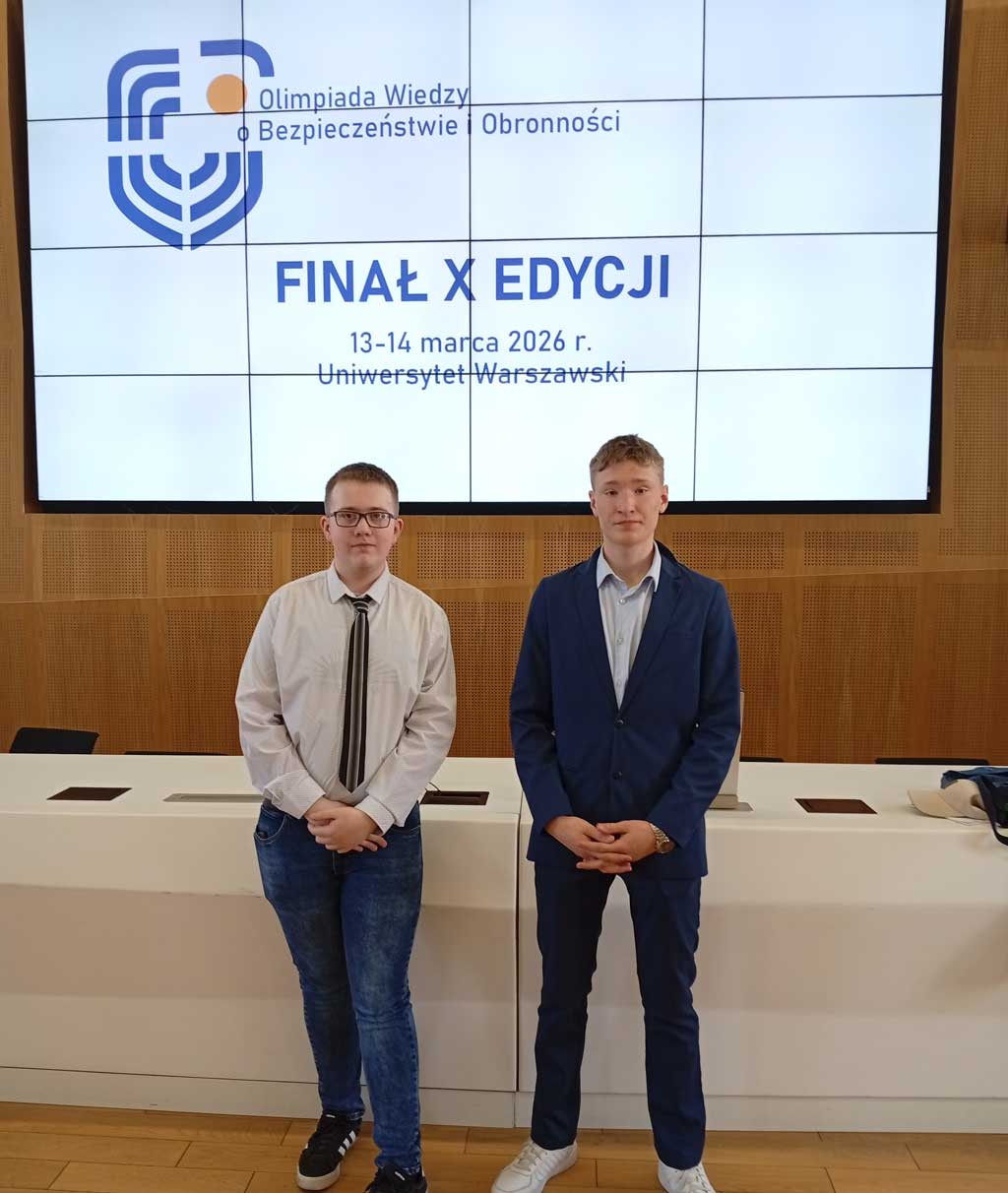W dniach 13-14.03.2026 dwóch uczniów naszej szkoły – Miłosz Majkowski ( klasa 3b) i Damian Maszkowski ( klasa 1e) uczestniczyło w etapie centralnym Olimpiady Wiedzy o Bezpieczeństwie i Obronności. Organizatorem finału był Wydział Nauk Politycznych Uniwersytetu Warszawskiego. Miłosz Majkowski uzyskał tytuł finalisty Olimpiady.