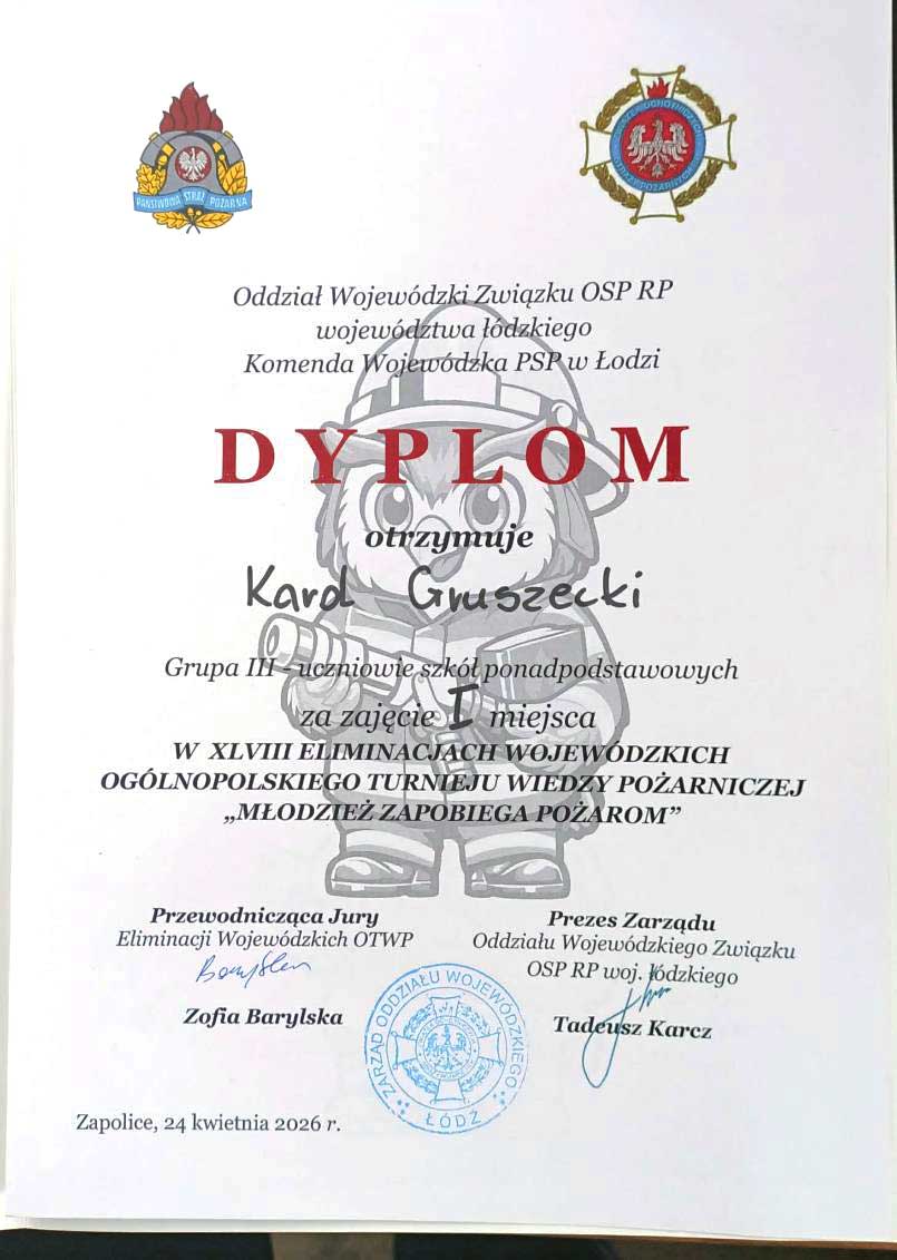 Po zwycięstwie w etapie miejskim i powiatowym, 24.04.2026 r. w Zapolicach Karol Gruszecki zajął również I miejsce w etapie wojewódzkim XLVIII Ogólnopolskiego Turnieju Wiedzy Pożarniczej. Będzie On reprezentował nasz region w zawodach centralnych w/w Turnieju w dniach 29 – 31.05.2026 r. w Częstochowie. Warto przypomnieć, że w poprzedniej edycji Karol w etapie centralnym zajął bardzo dobre 5 miejsce.